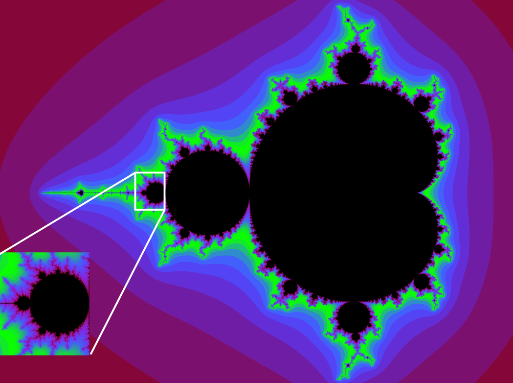 “Pero, ¿es un fractal en el sentido del conjunto de Mandelbrot? Pues eso parece. Analizando la imagen anterior vemos que tiene ciertas similitudes al fractal de Mandelbrot, pero además si hacemos zoom en varias partes (principalmente en las cercanas al borde del conjunto) encontraremos autosimilitud como se encuentra en el conjunto. Por ejemplo, aquí tenemos una imagen después de hacer zoom cerca del borde del conjunto central”[19] “este fractal de Collatz, como la mayoría de los fractales de su tipo, es un mundo donde a cada paso nos encontramos con algo nuevo a la vez que conocido”[20].